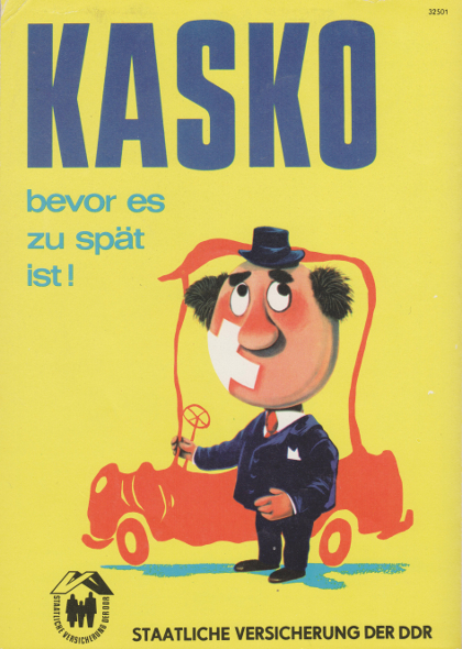Die Deutsche Versicherungsanstalt bot seit 1952 Autobesitzern die Möglichkeit, ihre Fahrzeuge Kasko zu versichern. Mit der serienmäßigen Herstellung des Trabant ab 1958, war die Zahl der Autobesitzer angestiegen. Mitte der 1960er Jahre wird für die Versicherten eine Reihe von Vergünstigungen in Kraft gesetzt. Die Versicherung initiiert daraufhin eine breit angelegte Werbekampagne unter dem Slogan „Kasko, bevor es zu spät ist!“. Die vom Grafiker Karl Schrader (1915-1981) entworfenen Karikaturen erschienen bis in die 1970er Jahre und trugen zur Popularisierung des Slogans im Alltag bei. Wenn jemand z.B. vor einem Risiko warnen wollte, schickte er oft diesen Spruch als Redewendung hinterher. Oder, wenn das Kind bereits in den Brunnnen gefallen war, hieß es lakonisch: „Kasko – Bevor es zu spät wird“.