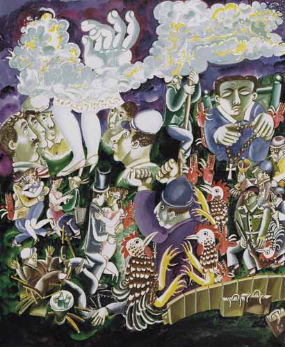 Herbert Bergmann-Hannak arbeitet gerne mit eigenwilligen Mitteln wie Kugelschreiber und Filzstift auf unkonventionellen Malgründen wie alten Rechnungen. Seine Bilder gegen Krieg und Militarismus, zu Religionen oder Theaterstücken beruhen auf einer anarchistischen Lebensauffassung und bestechen durch folkloristische Farbigkeit. Der Maler reproduziert detailreich den Kosmos seines Gedächtnisses und schafft mit quirligen Figuren ein Welttheater in der Tradition der erzählfreudigen russischen Bilderbuchgrafik. Seine Kindheit hatte er in Böhmen verbracht, eine Textilfachschule besucht und als Musterzeichner in einer Seidenfabrik gearbeitet. Als 18jähriger wurde er zur Wehrmacht einberufen und drei Jahre später auf der Krim schwer verwundet. Zurück in Böhmen sind es dann die stillen Landschaften und märchenhaften Wälder, die die Wunden heilen helfen. Aber die Bilder des Krieges wurde er nie wieder los.