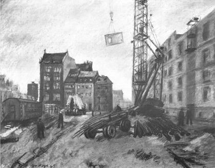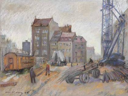 Auszug aus dem Aufsatz von Simone Tippach-Schneider: „In seinem Pastell Am Köllnischen Fischmarkt, das er dreizehn Jahre nach der Pastellserie Aufbau der Stalinallee malte, stand wieder das Baugeschehen im Mittelpunkt – Bauwagen, Teile eines Kranes und Betonplatten auf einem Tieflader lassen das vermuten. Und tatsächlich befand sich der Maler beim Errichten eines Neubaus wieder in Berlin-Mitte vor Ort. Er hatte auch die Front des hochgezogenen Plattenbaus gemalt. Doch später entfernte er dieses Motiv wieder, indem er den Bildrand an allen Seiten kürzte (1). Mit dem Wegfall des wuchtigen Gebäudes und der Enthauptung des Krans, stand nur noch eine kleine Zeile alter Häuser im Zentrum des Bildes. Der Maler schenkte den Spuren vom alten Berlin ein letztes Mal viel Raum – eigentlich zu viel Raum für eine ausgewogene Komposition. Es ging ihm dabei aber vermutlich weniger um kompositorische Fragen. Am Ende seines Lebens instrumentalisierte der erschöpfte Otto Nagel noch einmal die Kunst, zerschnitt eines seiner letzten Bilder und verweigerte damit dem Symbol Betonplatte die Leuchtkraft der Pigmente.“
