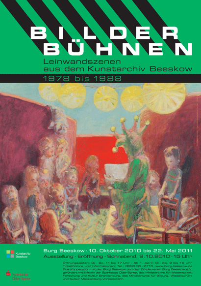 Die Ausstellung präsentiert Bilder mit ausdrucksstarken Figuren und szenische Darstellungen wie sie zur gleichen Zeit auf den Theaterbühnen des Landes zu erleben waren. Um diesem ersten Eindruck nachzugehen wurden Theaterwissenschaftler, Dramatiker und Regisseure gebeten, sich im Katalog zur Ausstellung den Bildern der 1980er Jahre aus der Perspektive eigener Erfahrungen zu nähern. Autoren: Thomas Irmer, Andrea Koschwitz, Hartmut Krug, Martin Linzer, Jörg Mihan, Simone Tippach-Schneider (Berlin), Barbara Kaesbohrer (München), Thomas Oberender (Salzburg).