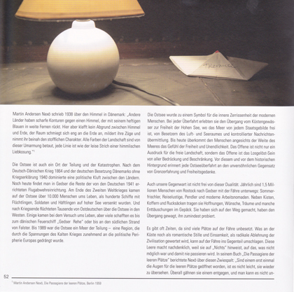 Die Ostsee wurde zu einem Symbol für die innere Zerrissenheit der modernen Menschen. Bei jeder Überfahrt erlebten sie den Übergang vom Küstengewässer zur Freiheit der Hohen See, wo das Meer von jedem Staatsgebilde frei ist, von Besetzern des Luft- und Seeraumes und kontrollierter Nachrichtenübermittlung. Bis heute überkommt dem Menschen angesichts der Weite des Meeres das Gefühl der Freiheit und Unendlichkeit. Das Offene ist nicht nur ein Ausdruck für die freie Landschaft, sondern das Offene ist das Losgelöst-Sein von aller Bedrückung und Beschränkung. Vor diesem und vor dem historischen Hintergrund erinnert jede Ostseeüberfahrt an den unversöhnlichen Gegensatz von Grenzerfahrung und Freiheitsgedanke.